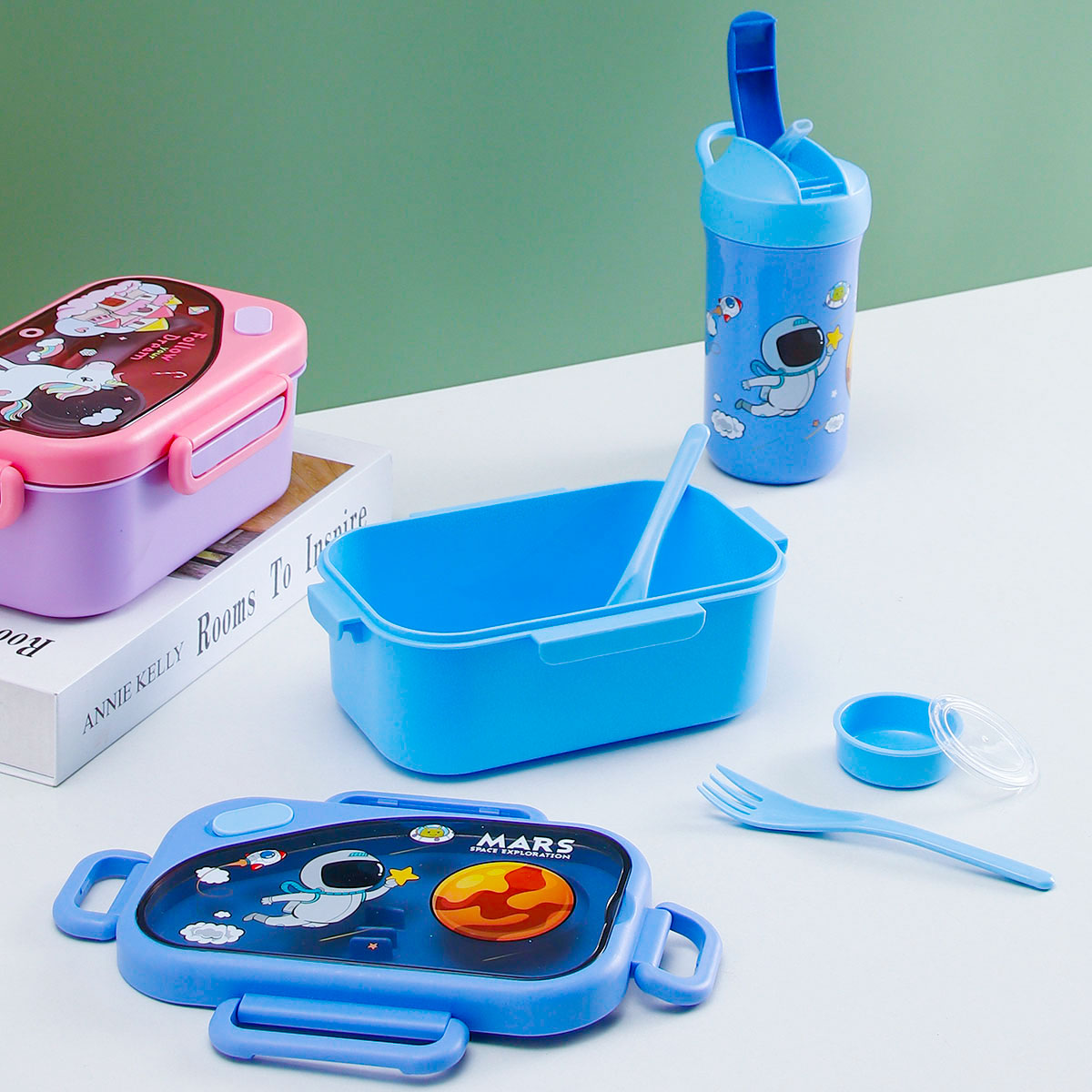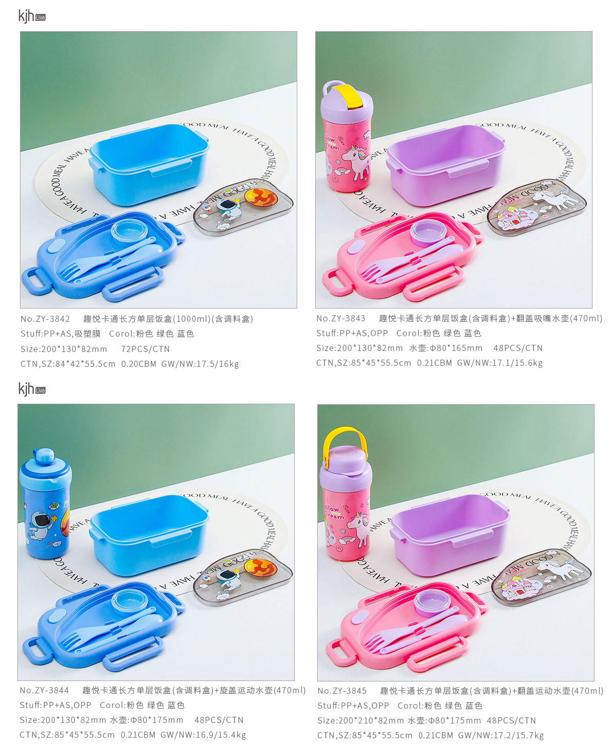 趣悅卡通長方單層/分格飯盒(含調料盒)+翻蓋吸嘴/旋蓋運動/翻蓋運動水壺