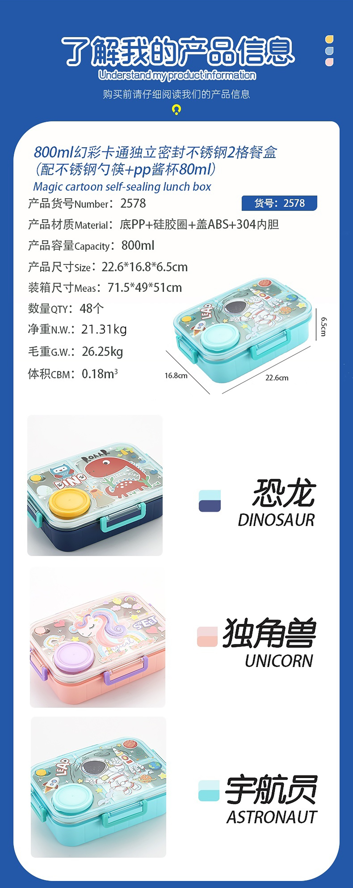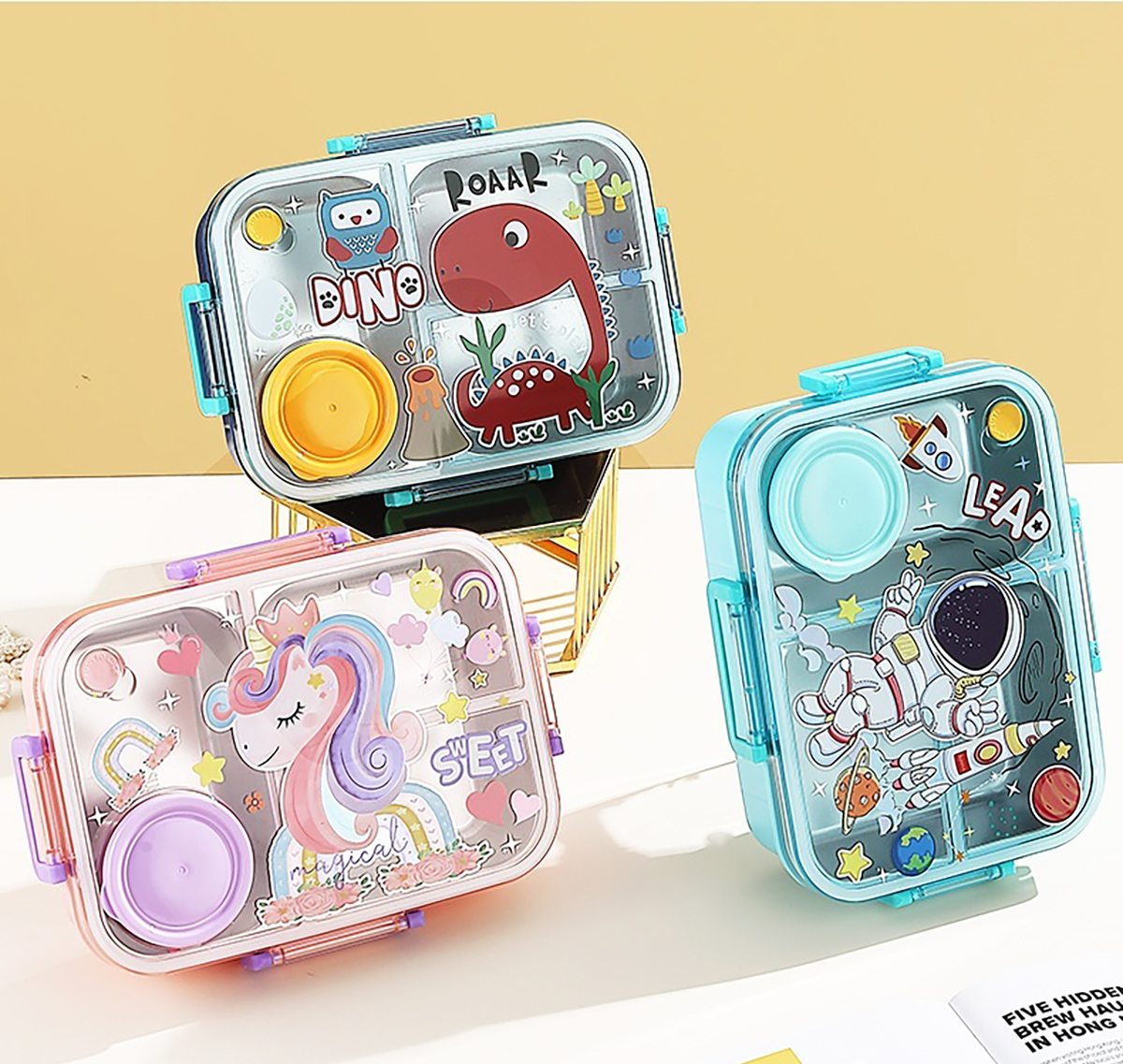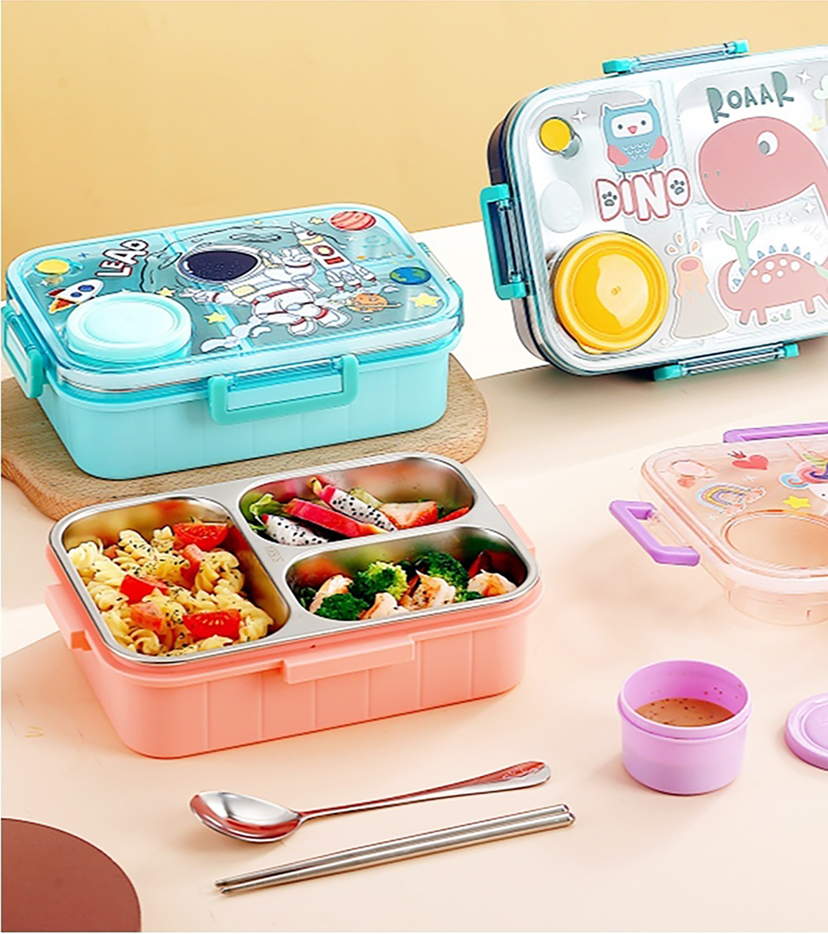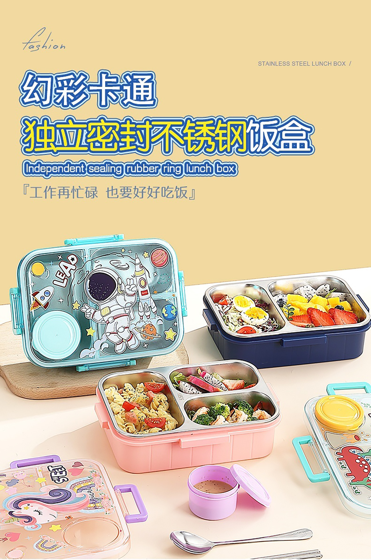 幻彩卡通獨立密封餐盒(2格800ml/3格750ml配不銹鋼勺筷+PP醬杯80ml)