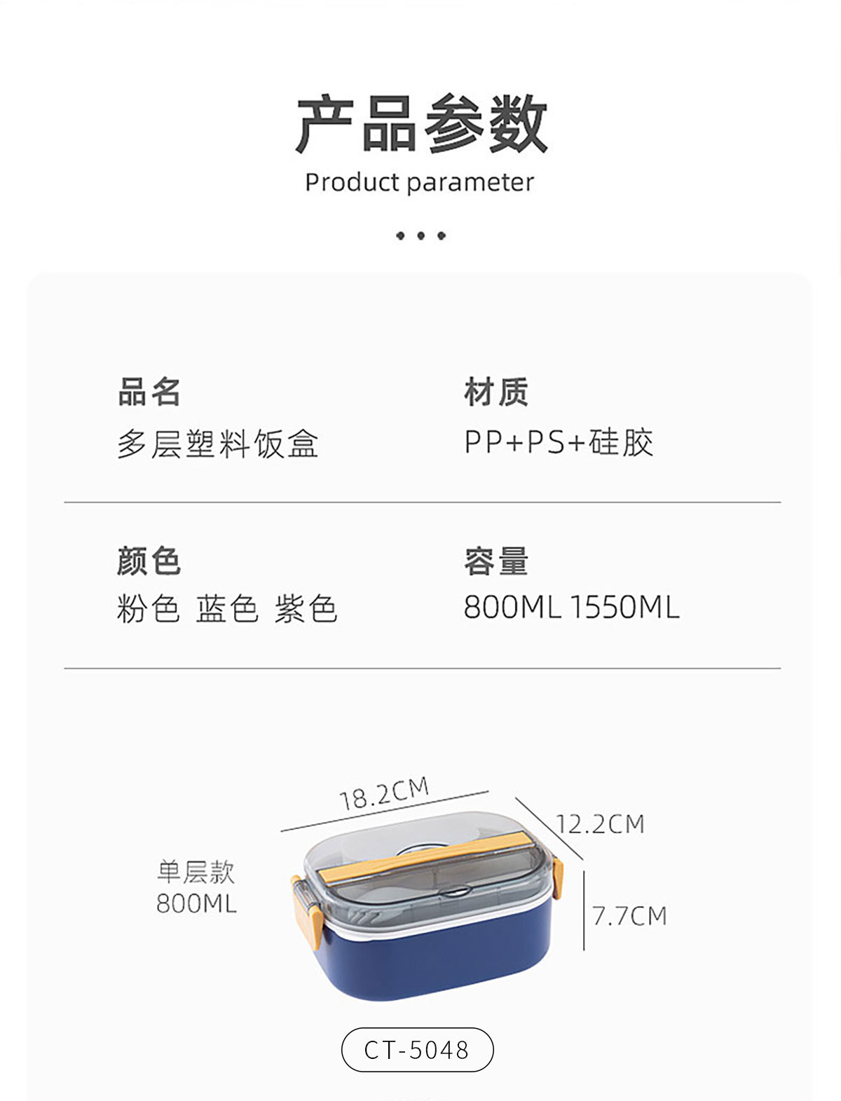 Size: CT-5048(單層):182*122*77mm/800ml