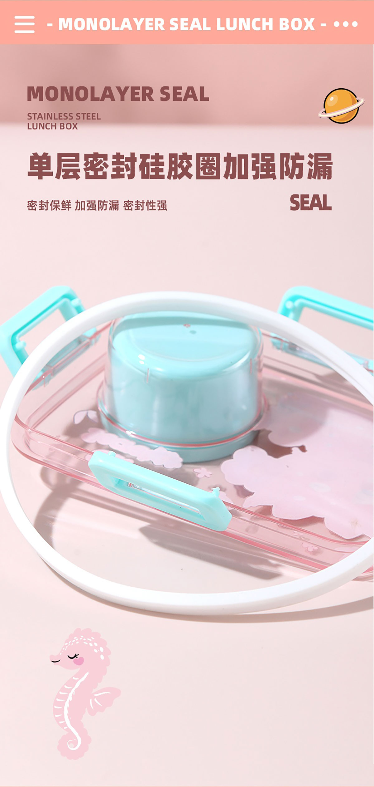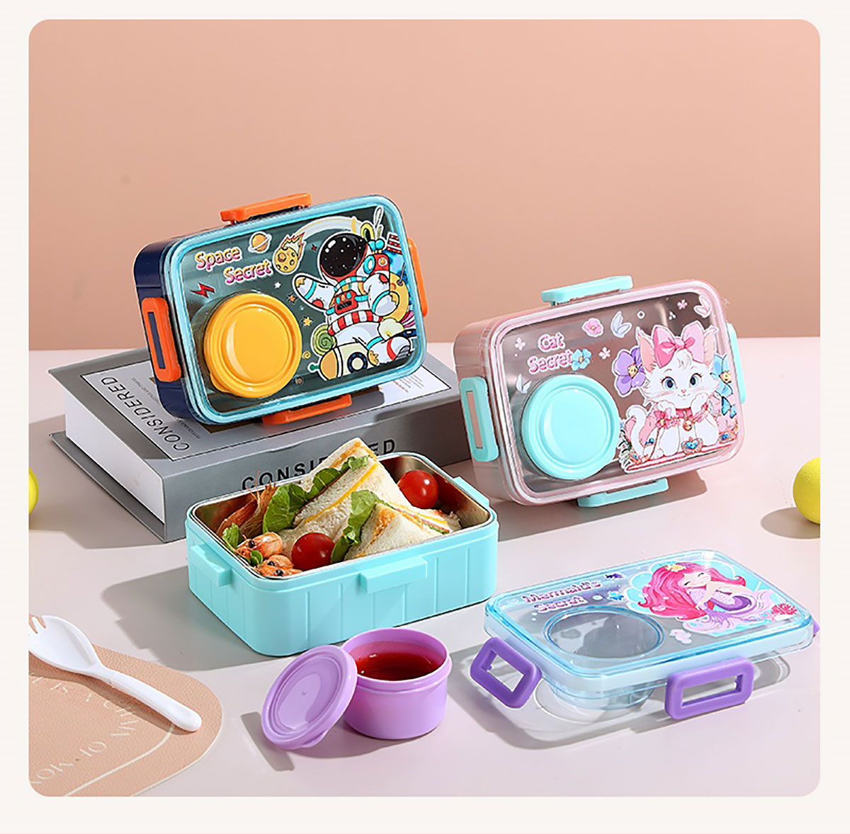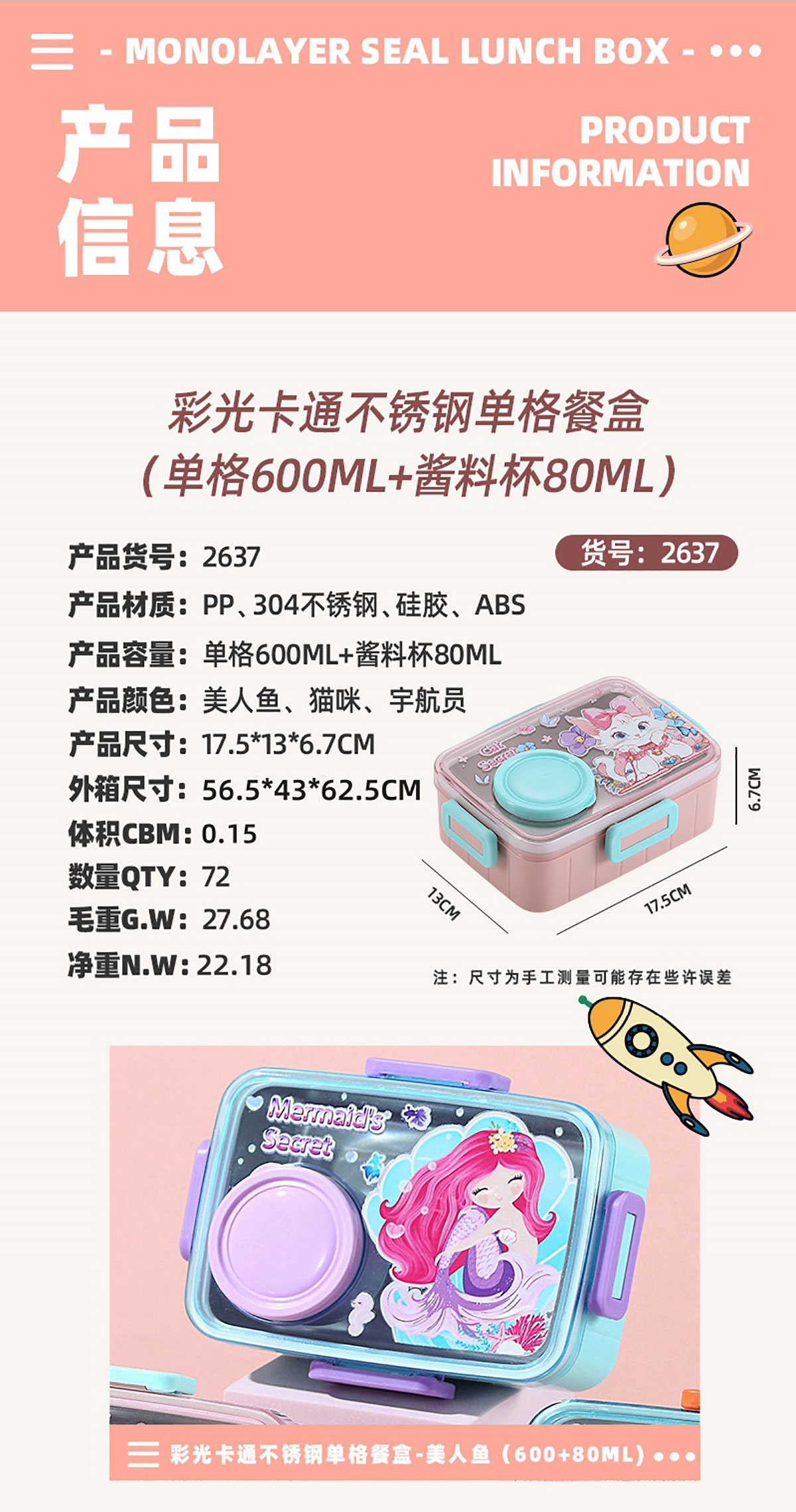 彩光卡通不銹鋼餐盒(單格600ml+外置醬料杯80ml)
