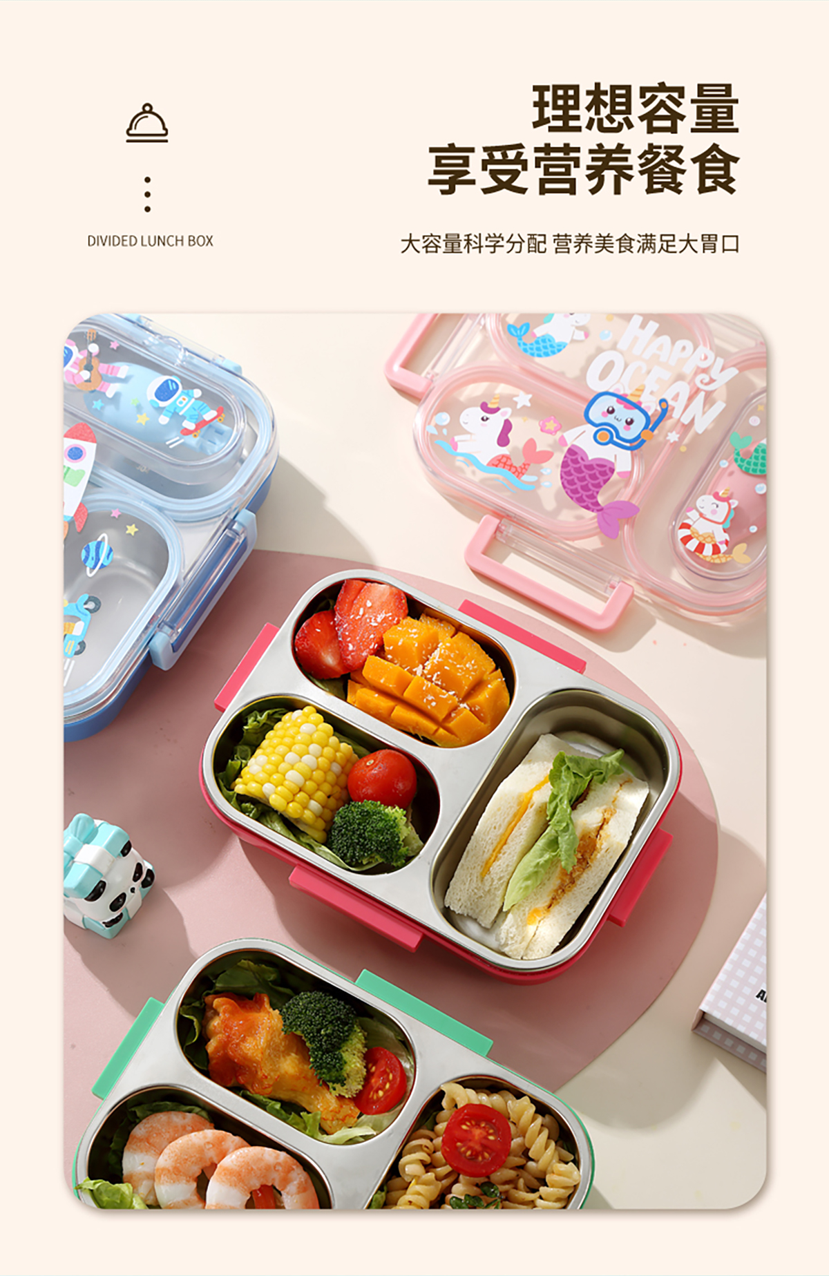 600ml UV獨(dú)立密封卡通不銹鋼餐盒2格/3格 (配PP折疊湯勺)